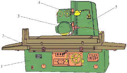 1—砂輪架 2—立柱 3—底座 4—工作臺(tái) 5—床身