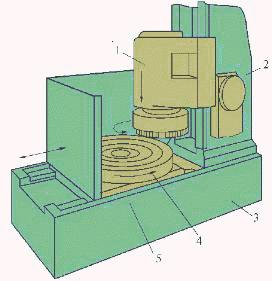 臥軸矩臺(tái)平面圓臺(tái)磨床如圖2所示。這種機(jī)床的砂輪主軸通常是由內(nèi)連式異步電動(dòng)機(jī)直接帶動(dòng)的。往往電機(jī)軸就是主軸,電動(dòng)的定子就裝在砂輪架3的體殼內(nèi)。砂輪架3可沿滑座4的燕尾導(dǎo)軌作間歇的橫向進(jìn)給運(yùn)動(dòng)(手動(dòng)或液動(dòng));4和砂輪架3一起,沿立柱5的導(dǎo)軌作間歇的豎直切入運(yùn)動(dòng)(手動(dòng))。工作臺(tái)2沿床身1的導(dǎo)軌作縱向往復(fù)運(yùn)動(dòng)(液壓傳動(dòng))。